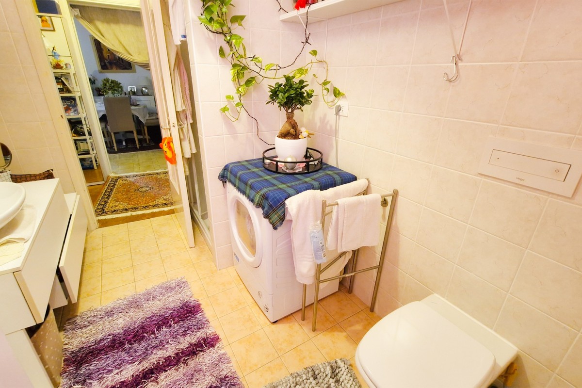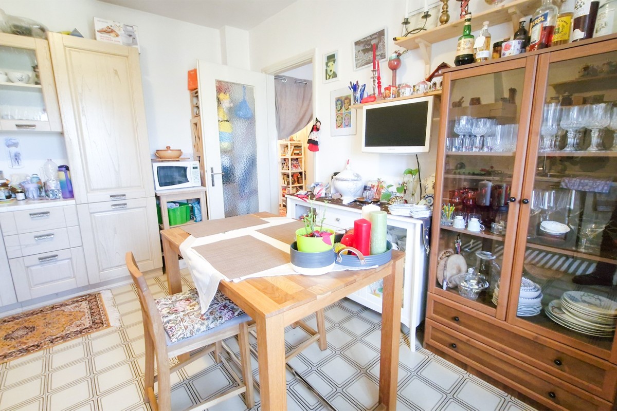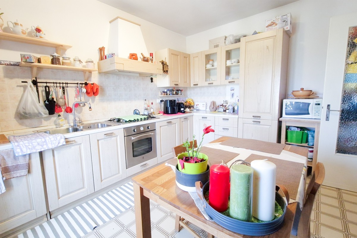 L’appartamento si apre su un ampio e luminoso soggiorno, impreziosito da una finestra che illumina l’ambiente e da una confortevole zona pranzo. La cucina, separata e arredata con gusto, è dotata di mobili su misura di alta qualità, inclusi nel prezzo, e si affaccia sul verde circostante, regalando una piacevole vista.