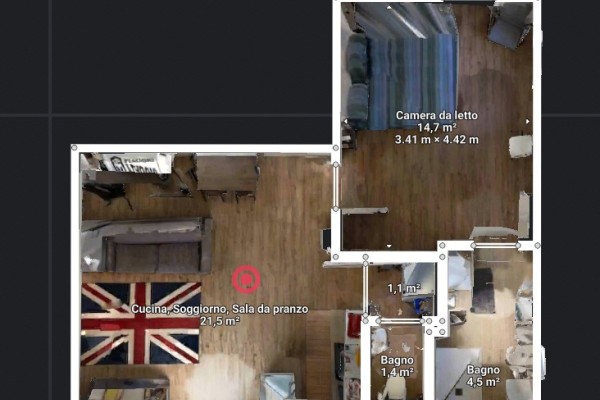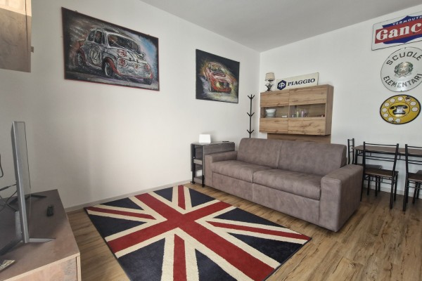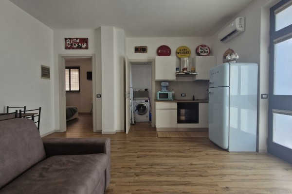 All'entrata veniamo accolti da un open space con salottino e angolo cucina, antibagno che funge da zona lavanderia e piccolo bagno finestrato .